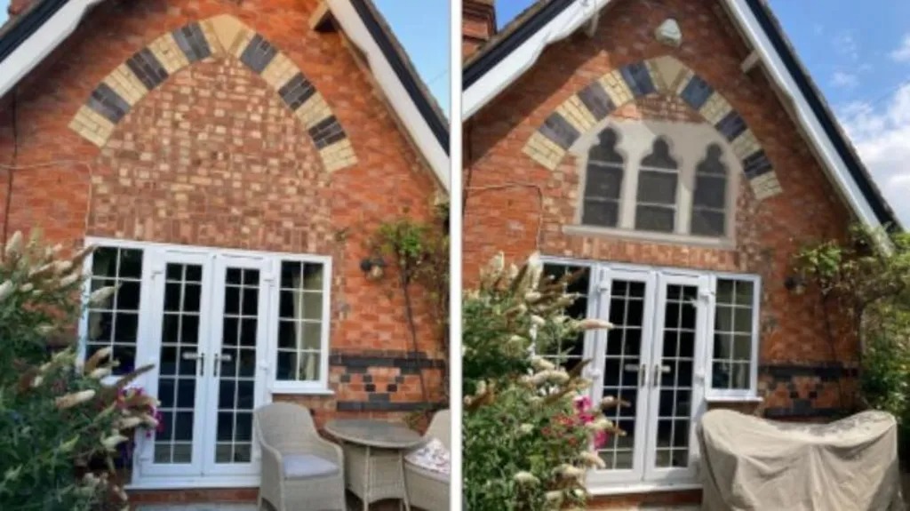 Ngôi nhà bên trái vẫn như hiện tại, và hình ảnh bên phải là ngôi nhà trông như mong đợi với bức tranh tường được vẽ
