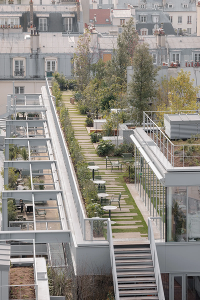 Studio kiến trúc PCA-STREAM đã biến cấu trúc bê tông thô của bãi xe cũ thành khách sạn sang trọng, giữ lại trọn vẹn tinh thần brutalist. Đường dốc bê tông xoắn ốc dẫn thẳng vào sảnh chính như dấu vết quá khứ, trong khi điểm nhấn mới ngoạn mục là khu vườn mái 1.500 m² với tầm nhìn trải dài từ Sacré-Cœur đến tháp Eiffel.