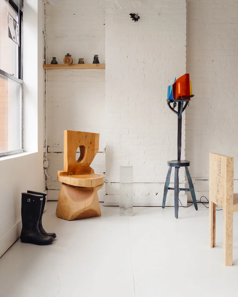 Tại lối vào phòng trưng bày căn hộ của Alex Tieghi-Walker ở TriBeCa, New York, trưng bày Ghế Seventh Street của Vince Skelly và Đèn đứng của Leo Kaspar và Andrew Pierce Scott. Ảnh: Ike Ideani