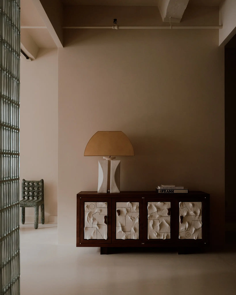 Tại tiền sảnh showroom nhà riêng của Danny Kaplan trên phố Lafayette ở Manhattan, đèn DKS Eloise được đặt trên tủ đựng đồ cá nhân DKS. Phía sau là chiếc ghế của Thomas Barger. Ảnh: William Jess Laird