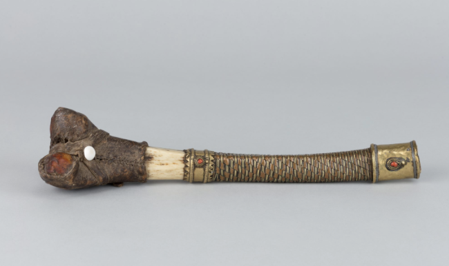 Kèn xương chân (Kang Ling); Tây Tạng; thế kỷ 18-19; Xương người, đồng, san hô, da; Bảo tàng nghệ thuật Himalaya Rubin, Quà tặng của Robert và Lois Bayils; SC2019.3.2