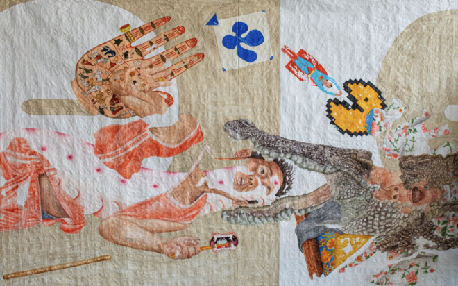 Những suy tư về hỗn loạn và ân sủng là trung tâm của bức tranh “Câu thần chú của tâm trí khỉ”, một tác phẩm đã mang lại cho người nghệ sĩ Giải thưởng nghệ thuật Himalaya từ Bảo tàng Rubin, trong khuôn khổ triển lãm Reimagine: Himalayan Art Now. Được khơi nguồn cảm hứng từ sự phức hợp của đời sống con người—đặc biệt là sự giằng co giữa tham vọng và lòng trắc ẩn—bức tranh là một thiền quán thị giác về căng thẳng nội tại của nhân loại.