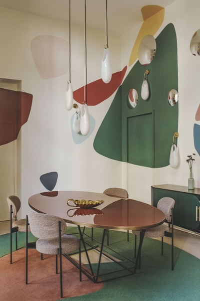 Tại một căn hộ ở Paris, phòng ăn nổi bật với bức tranh tường sống động gợi nhớ tác phẩm của Alexander Calder. Đây là điểm nhấn nghệ thuật đương đại duy nhất trong ngôi nhà mang bảng màu trung tính, do họa sĩ Ottavia Moschini – vốn nổi tiếng với tranh cổ điển – thực hiện. Đồ nội thất sơn mài và thảm hình học được lựa chọn để cộng hưởng cùng bảng màu giàu cảm xúc.
