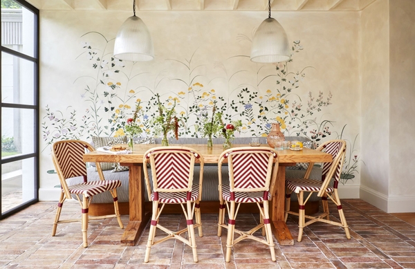 Không gian phòng ăn trong ngôi nhà này được mở rộng về thị giác lẫn cảm giác nhờ bức tranh tường vẽ tay mô tả vườn hoa mùa xuân rực rỡ. Nghệ sĩ Eugenia Barrios Osborne đã đưa thiên nhiên vào nhà, trong khi thiết kế của Tiffany Dugan giúp kết nối trong – ngoài bằng cửa kính và sàn đất nung.