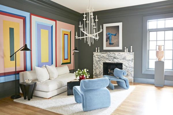 Với nghệ sĩ Angela Chrusciaki Blehm, màu sắc là liệu pháp chữa lành. Bức tranh tường do chính cô thực hiện trong phòng khách tại Atlanta mang đậm tinh thần Memphis và Bauhaus – rực rỡ, vui tươi và giải phóng hình khối. Thiết kế táo bạo được cân bằng bởi những chiếc ghế kinh điển của Jan Ekselius và tranh treo đơn sắc trên lò sưởi.