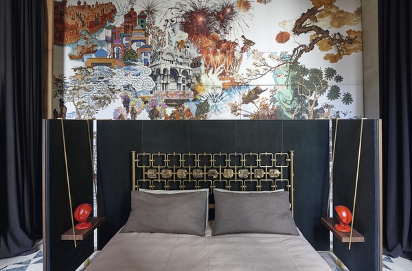 Tại Venice, kiến trúc sư Massimo Adario kết hợp tinh thần thiết kế của Tobia Scarpa và yếu tố nghệ thuật Á – Âu trong không gian phòng ngủ. Bức tranh tường do Francesco Simeti vẽ riêng cho công trình này là điểm hội tụ của văn hóa, nghệ thuật và sự thủ công tinh xảo – từ đầu giường bằng đồng của Pomodoro đến đèn bàn Flos cổ điển.