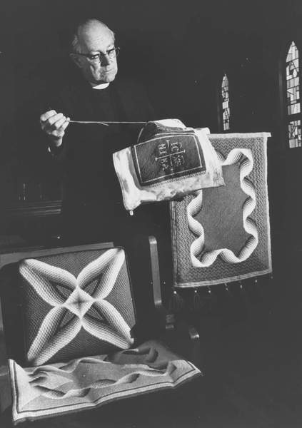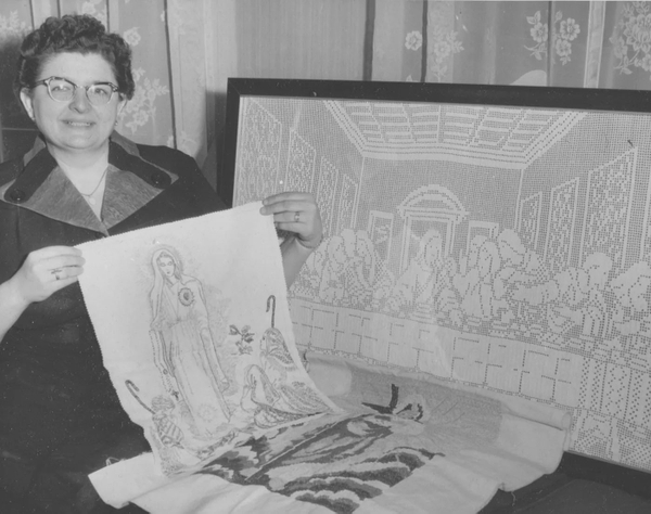 Người phụ nữ bên cạnh tác phẩm đan móc về tôn giáo, 1955