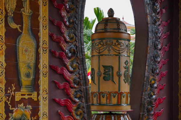 Một điểm nhấn nổi bật là bức phù điêu “Om Mani” rộng 4m², ghép hoàn toàn từ những mảnh gốm màu sắc rực rỡ, đặt ngay lối vào chính điện Tam Bảo.