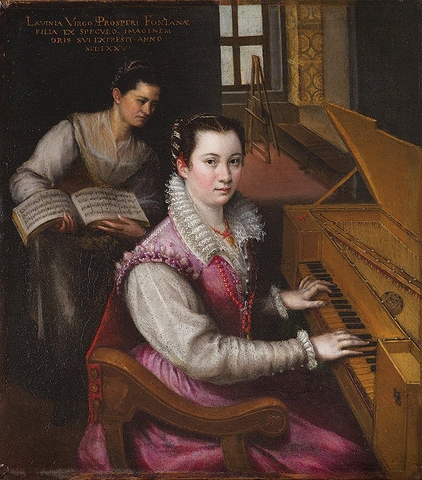 Bức tranh chân dung tự họa của Fontana năm 1577, trong tư thế ngồi trước một cây đàn virginal, ghi lại quá trình đào tạo ban đầu của bà. Trong bức tranh, Fontana thể hiện sự tự tin với khả năng chơi đàn mà không cần nhìn, đồng thời nhận thức rằng mình đang là đối tượng được nhìn chằm chằm. Bà không mặc trang phục thường ngày mà là một bộ đồ lộng lẫy, với chiếc váy đỏ mềm mại, ngọc trai, ren, và các phụ kiện như ruy băng vàng và vòng cổ san hô. Một người phụ nữ đứng gần đó cầm bản nhạc mở, nhấn mạnh kỹ năng âm nhạc của Fontana và có thể liên quan đến công việc xuất bản của gia đình bà. Bức chân dung cũng bao gồm một lối vào dẫn vào khu vực xưởng vẽ, ám chỉ đến quá trình đào tạo nghệ thuật của bà. Hình thức chân dung này có thể gợi nhớ đến một bức tranh chân dung tự họa trước đó của Sofonisba Anguissola, một nữ họa sĩ Ý thế kỷ 16 nổi tiếng với vai trò họa sĩ chân dung trong triều đình của Phillip II của Tây Ban Nha.