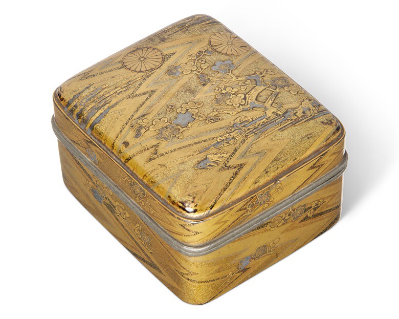 (chú thích ảnh) Một hộp phụ kiện hình chữ nhật sơn mài nhỏ của Nhật Bản (tebako), thời Edo (thế kỷ 18). Cao 2¼ in (5 cm) x rộng 3½ (8,5 cm). Giá trị ước tính: 1.000-1.500 bảng Anh. Cung cấp trong Bộ sưu tập Soame Jenyns của Nhật Bản và Trung Quốc Art, 1-8 tháng 11, trực tuyến.