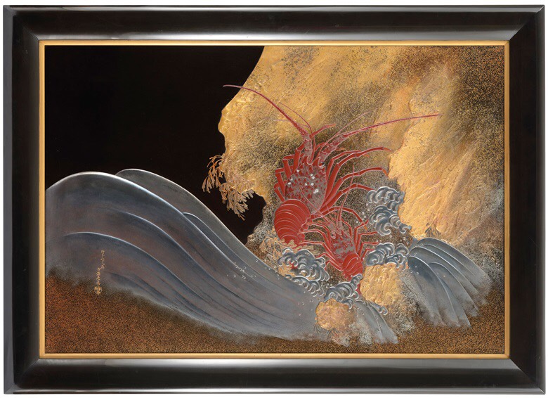 (chú thích ảnh) Một tấm sơn mài đẹp khắc họa những con tôm hùm, có chữ ký của Gyonen Hachijuni O Koma Zeshin [Một ông già ở tuổi 82, Koma Zeshin], Meiji năm thứ 21 (1888). 96 cm x 105,6 cm. Được bán với giá £ 662.500 vào ngày 15 tháng 10 năm 2014 tại Christie's ở London