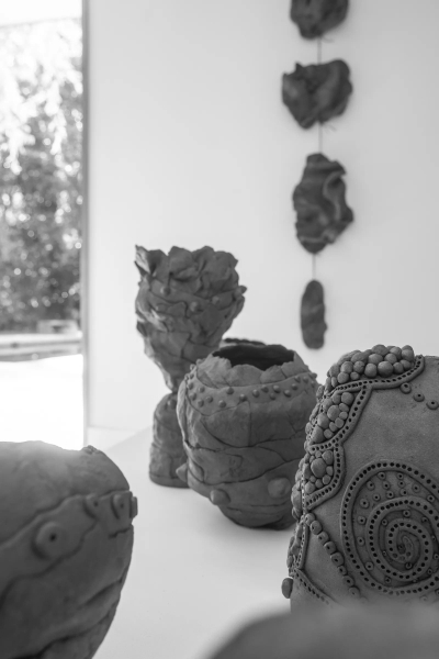 Tại triển lãm cá nhân tại phòng tranh Twentieth (Los Angeles), Samuels giới thiệu ba loạt tác phẩm – Open, Portal và Wave Medallion – như một lời mời người xem bước vào thế giới nội tâm nhiều lớp của cô. Không sử dụng bàn xoay, không men phủ, cô làm việc gần như hoàn toàn bằng tay, với đất sét sẫm màu, để giữ lại nét thô mộc nguyên bản. Với cô, đây là cách “được là thật – không tô điểm, không giấu giếm.”