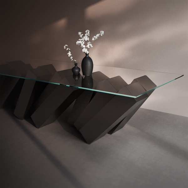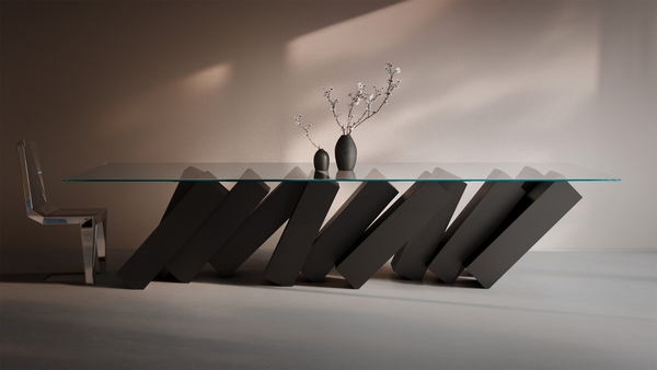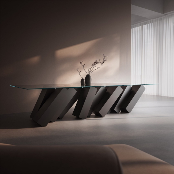 Mặt bàn kính dày đặt trên phần chân thép đặc nặng nề, được cấu thành từ những khối chữ nhật nghiêng như một hàng domino bị bắt dừng giữa chừng. Hiệu ứng này vừa gợi sự chơi đùa với ảo giác, vừa đem lại cảm giác mong manh, sắp sụp đổ, trong khi cấu trúc thực tế vẫn vững chắc.