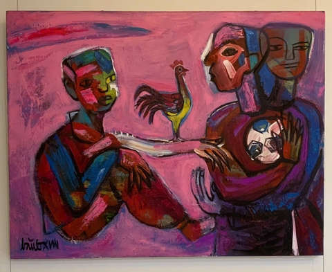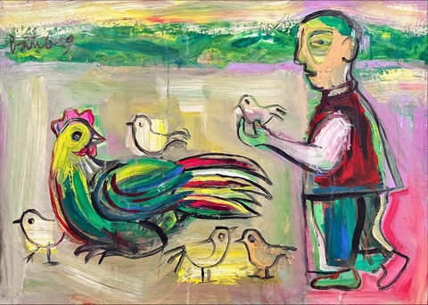 Bức tranh gợi lên hình ảnh gia đình gà – một biểu tượng dân dã quen thuộc trong làng quê Việt. Con gà mẹ sặc sỡ như một dải lụa màu, vây quanh là đàn con và một người nông dân ôm chim non. Bút pháp biểu hiện sử dụng các mảng màu dày và nét viền đậm không chỉ làm nổi khối hình mà còn nhấn mạnh cảm xúc yêu thương, gắn bó giữa người và vật. Khung cảnh xanh mướt gợi không khí thôn quê thanh bình vùng Kinh Bắc.