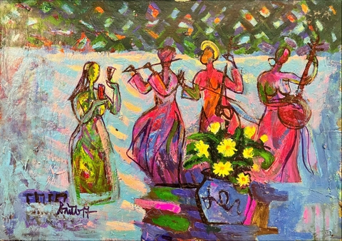 Một nhóm phụ nữ trong tà áo dài đang chơi nhạc cụ dân tộc giữa thiên nhiên, với bình hoa cúc nở rộ phía trước – gợi mùa xuân tươi mới và rộn ràng. Đỗ Bảng sử dụng các gam hồng, tím, cam để thổi vào tranh một sức sống phơi phới, trong đó âm nhạc và mùa xuân như hòa quyện thành một thể thống nhất. Đây là hình ảnh thường thấy trong các hội xuân dân gian Kinh Bắc, nơi nghệ thuật và đời sống không tách rời.