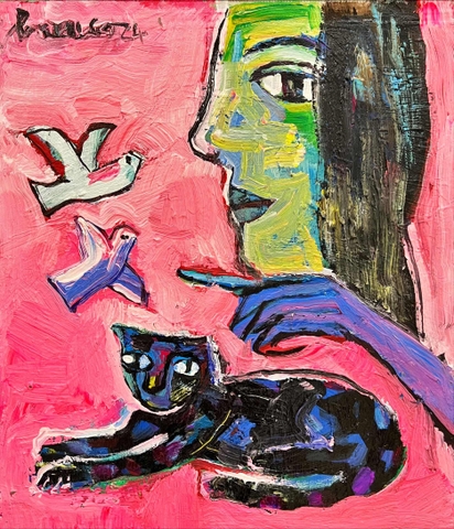 Hình ảnh cô gái, chim bồ câu và mèo – ba biểu tượng được kết nối trong một bố cục dồn nén trên nền hồng rực. Bức tranh mang tính biểu tượng của một năm tuổi – Tuổi Mão – gắn với nét dịu dàng, nhạy cảm và độc lập. Đường nét ngắn, màu sắc đối lập làm bật lên sự đối thoại giữa các yếu tố – người, vật, và biểu trưng thời gian.