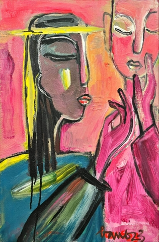 Hình ảnh hai khuôn mặt giao nhau trong sắc hồng rực rỡ, với đôi mắt nhắm lại như đang mơ – là một ẩn dụ thị giác cho tuổi mới lớn. Đỗ Bảng khắc họa những biến chuyển nội tâm tuổi dậy thì bằng nét vẽ giàu cảm xúc, hình thể nữ tính, tay chạm má thể hiện sự khám phá bản thân. Tranh nghiêng về biểu hiện tâm lý, nhưng vẫn gắn với cảm quan Kinh Bắc: dịu dàng, kín đáo, sâu lắng.
