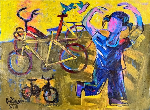 Một cô bé chạy nhảy giữa những chiếc xe đạp, với đôi chim bay lượn – là hình ảnh biểu trưng cho sự hồn nhiên, ước mơ tự do của trẻ em nông thôn. Tranh sử dụng nền vàng rực và nét vẽ phóng túng để tái hiện không gian mùa hè rực nắng. Đây là khúc nhạc của tuổi thơ – vừa rộn ràng, vừa tươi sáng – thường xuất hiện trong hồi ức người Kinh Bắc.