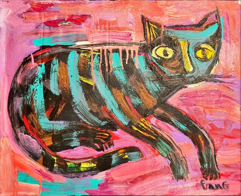Chú mèo với đôi mắt vàng rực và tư thế uy nghi được phóng đại lên như một biểu tượng đầy cá tính. Bức tranh mang tính trào lộng, khi dùng dáng vẻ loài vật để phản ánh cái tôi của con người. Tông màu nóng – lạnh tương phản giúp khắc họa rõ nét tính cách “vương giả” của nhân vật trung tâm, đồng thời vẫn giữ được chất dân gian dí dỏm của hội họa Kinh Bắc.