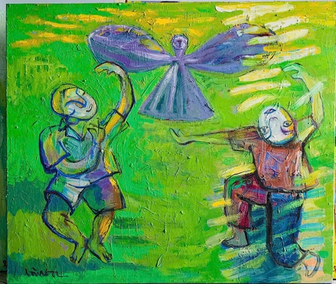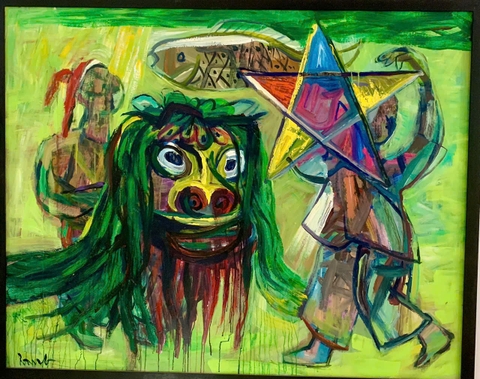 Múa lân, rước đèn ông sao, cá giấy – những biểu tượng mùa hội hiện lên sống động trên nền xanh non. Dáng vẻ nhân vật được cách điệu theo phong cách tranh dân gian Đông Hồ nhưng thể hiện bằng cọ dày, màu vỡ nét hiện đại. Đây là một tuyên ngôn rõ nét về hội họa Kinh Bắc – nơi dân ca, lễ hội và mỹ thuật quyện hòa.