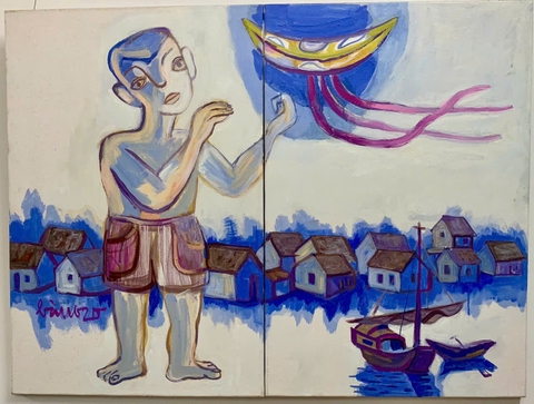 Hai đứa trẻ nô đùa dưới bầu trời xanh ngát, mắt hướng theo cánh diều tím bay lên. Bút pháp mạnh mẽ, màu xanh – vàng tương phản, tạo nên sự trẻ trung và hân hoan. Cánh diều tượng trưng cho ước mơ và khát vọng, đặc biệt là khát vọng tự do trong ký ức tuổi thơ Bắc Bộ.