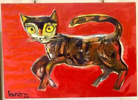 Chú mèo với dáng vẻ ngơ ngác và đôi mắt tròn xoe chiếm trọn khung tranh đỏ rực, gợi cảm giác vừa tò mò, vừa cảnh giác. Tông màu nóng làm nổi bật đường nét mèo như biểu tượng của sự lanh lẹ, gần gũi trong đời sống dân dã. Bút pháp biểu hiện thể hiện rõ qua những mảng màu xô lệch và khối hình lập thể hóa thân mèo, cho thấy sự phá cách trong mỹ học dân gian hiện đại.