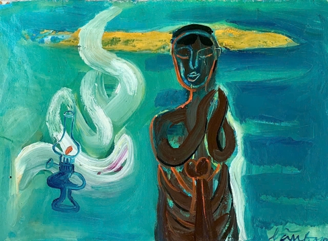 Một tác phẩm có chiều sâu tĩnh tâm. Nhân vật nhắm mắt chắp tay trong thiền định giữa nền màu lam – lục loang lổ, bên cạnh là chiếc đèn dầu và vệt khói mờ. Màu sắc lạnh kết hợp đường viền cam ấm trên cơ thể người hành thiền tạo sự tương phản thanh lọc. Đây là hình ảnh tiêu biểu của đời sống tâm linh xứ Kinh Bắc, nơi tín ngưỡng và thiền tịnh song hành.