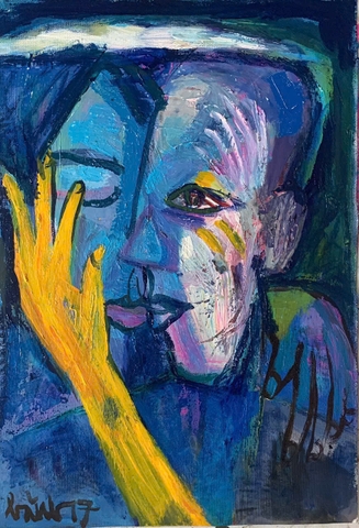 Gương mặt mơ màng với bàn tay che nửa mặt, tranh khai thác vùng giao thoa giữa ý thức và tiềm thức. Cấu trúc khuôn mặt phân tách, những nét cọ gấp gáp và màu tím – xanh gợi trạng thái mộng mị. Đây là tác phẩm tiêu biểu cho sự kết hợp giữa biểu hiện chủ quan và ẩn dụ tâm lý.