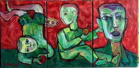 Tranh ba tấm (triptych) thể hiện ba trạng thái: trò chơi, sự chăm sóc và suy tư. Nhân vật nam chính xuất hiện ba lần, tạo nên nhịp điệu thị giác. Hình ảnh quả táo có thể mang hàm nghĩa biểu tượng cho sự nuôi dưỡng và hy sinh. Màu đỏ – xanh đậm chồng lấn khiến không khí trở nên ấm áp nhưng phức tạp. Đây là hình ảnh tình phụ tử dân gian được lột tả dưới lăng kính tâm lý học hiện đại.