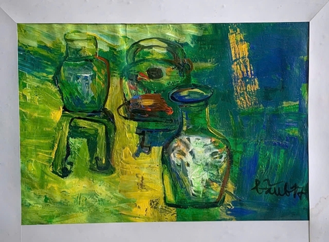 Những lọ thủy tinh, ấm đun nước được bố trí lệch nhịp trên nền xanh – vàng loang. Dáng vẻ nghiêng lệch, viền màu thô bạo khiến đồ vật trở nên có linh hồn. Dù là tranh tĩnh vật nhưng vẫn đậm dấu ấn sinh hoạt Bắc Ninh – nơi đời sống gắn liền với vật dụng dân dã.