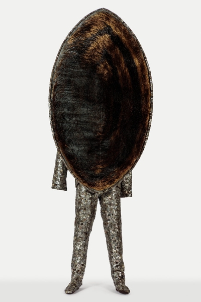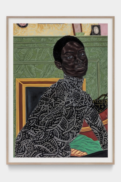 Một tác phẩm điêu khắc Soundsuit của nghệ sĩ sợi Nick Cave trò chuyện với những bức tranh phác thảo tinh xảo bằng than chì và bút chì của nghệ sĩ Nigeria Toyin Ojih Odutola, với những chi tiết mắt ngọc lấp lánh tôn lên vẻ đẹp thanh thoát trong các nhân vật của cô.