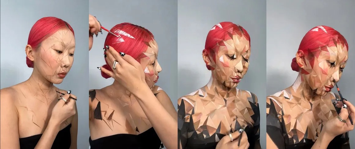 Trong một bức ảnh tự họa của Yoon, cô biến mình thành một tác phẩm hình học 3D đầy mê hoặc bằng cách tô màu các hình tam giác trong sáng và tối.