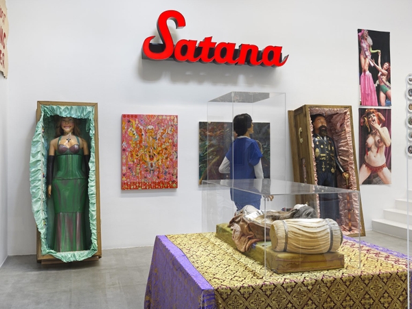 Không gian sắp đặt triển lãm Carnival do Joe Coleman giám tuyển. Các tác phẩm bao gồm tượng sáp Thánh Agnes ở tiền cảnh, hai quan tài nghệ thuật của Coleman và vợ ông, Whitney Ward, mặc trang phục cưới, do nghệ sĩ Ghana Theophilus Nii Anum Sowah chế tác. Ảnh: do Jeffrey Deitch, New York cung cấp.