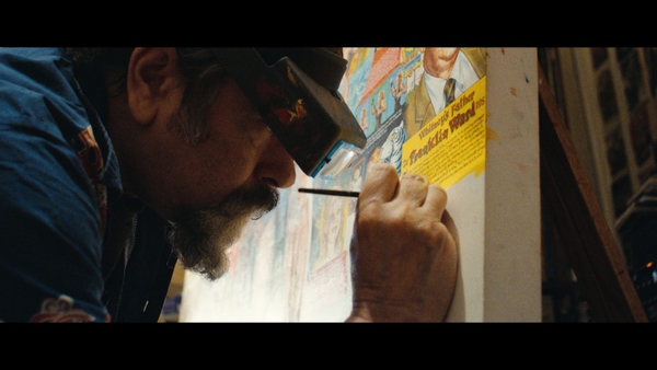 Joe Coleman vẽ tranh với kính phóng đại trong một cảnh phim How Dark My Love (2025). Ảnh: Gregg de Domenico.
