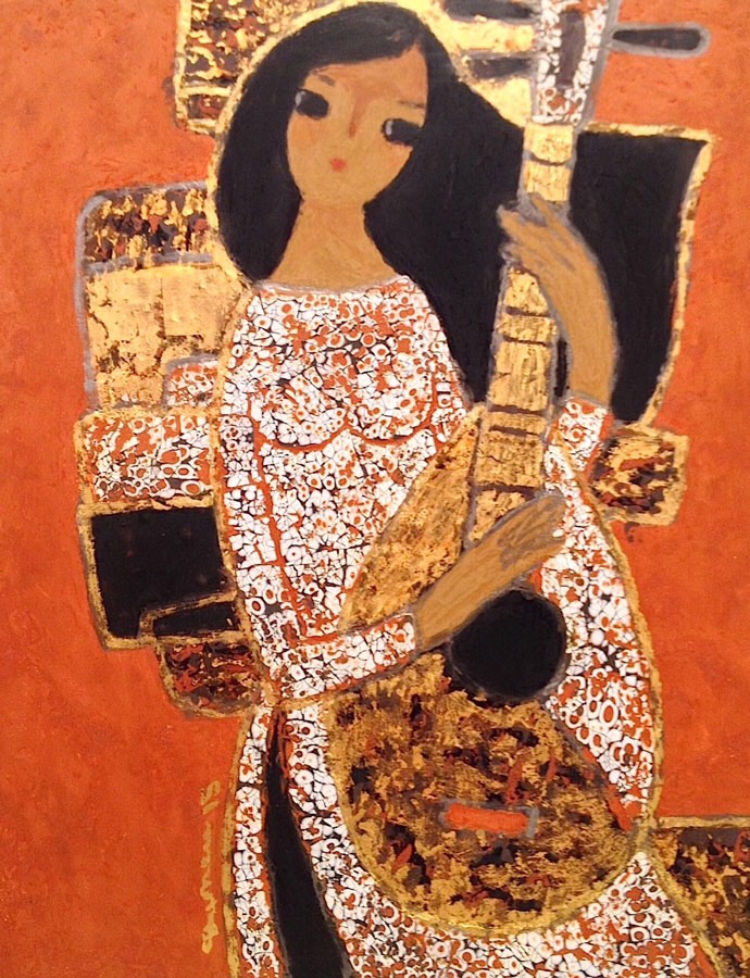 Dương Sen, tác phẩm Thiếu nữ với đàn Mandoline, 40x50cm, Sơn mài trên vóc. Ảnh: ArtBlue Studio