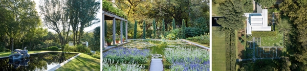 Chính kiến trúc sư Paul Rudolph đã giới thiệu Page cho gia đình Bass, sau khi ông ấn tượng với khu vườn mà Page thiết kế cho Bộ sưu tập Frick Collection ở New York. Ở đây, hàng sồi được cắt tỉa hình chữ nhật tạo bóng dài vào bình minh và hoàng hôn, cùng những luống hoa vuông vắn như phản ánh chính đường nét của kiến trúc ngôi nhà. Trong hồ nước là tác phẩm điêu khắc lớn La Rivière – hình tượng người phụ nữ nằm nghỉ ngơi, được bao quanh bởi hoa súng nhiệt đới. Một nhà kính hình chong chóng cũng được xây riêng để ông Bass trồng lan.