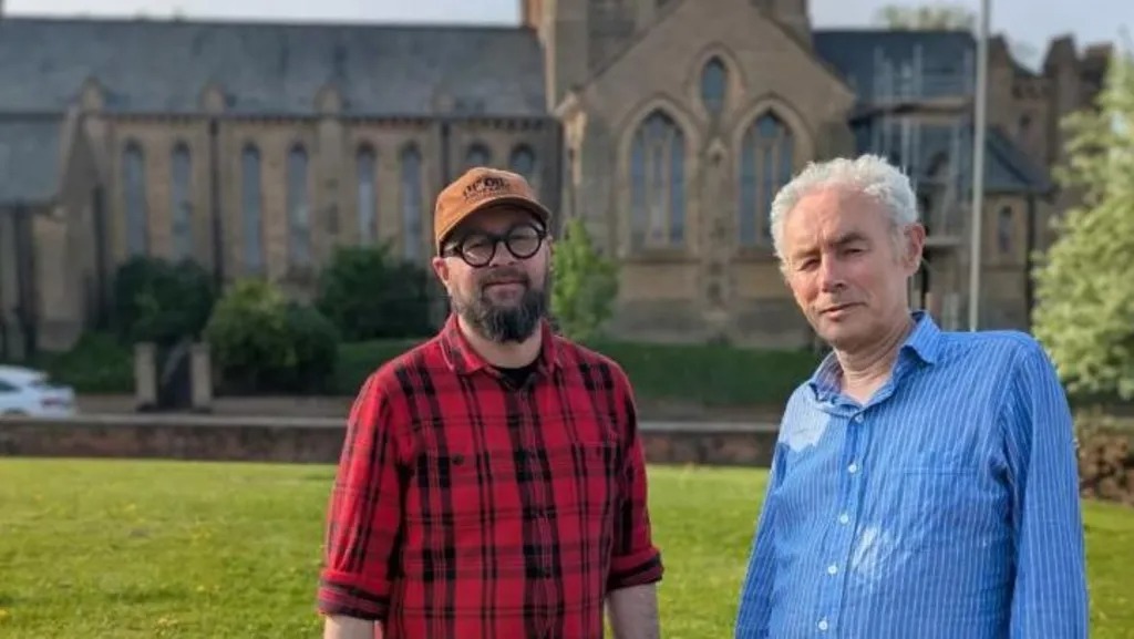 Nghệ sĩ Narbi Price (trái) và Mark Hudson trước nhà thờ St Mary ở Horden, một trong những địa điểm tổ chức một phần của triển lãm