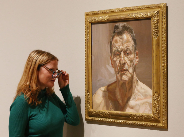 Bức tranh chân dung “Reflection, Self Portrait (1985)” của Lucian Freud đang được trưng bày tại “Lucian Freud: The Self-portraits” (Những bức tranh chân dung tự hoạ) tại Học viện Nghệ thuật Hoàng gia, London. Ảnh: Jonathan Brady/PA Images qua Getty Images.