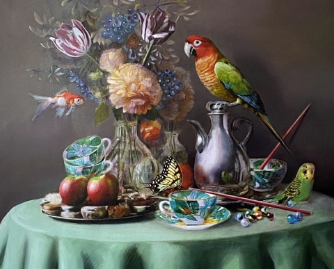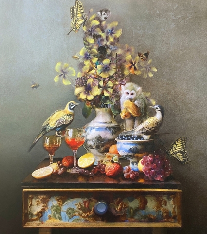 "Tôi muốn mọi người cảm thấy như họ đã tình cờ gặp phải một câu đố", Jason Wheatley nói về những bức tranh mơ mộng của mình. Kết hợp cách mô tả thực tế với những yếu tố kỳ ảo, nghệ sĩ đã làm mới tranh tĩnh vật bằng cách thêm động vật và côn trùng vào chủ đề vô tri vô giác. Trong bộ sưu tập sáng tác mới nhất “Ngôn ngữ của các loài chim”, hoạ sĩ mô tả một loạt các loài chim hoang dã kỳ lạ trong nội thất xa hoa cùng với nhiều loài linh trưởng nhỏ, bướm và cá.