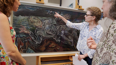 ( From left: Megan Fontanella, Julie Barten, and Vivien Greene with Oskar Kokoschka’s Knight Errant (1914–15 )