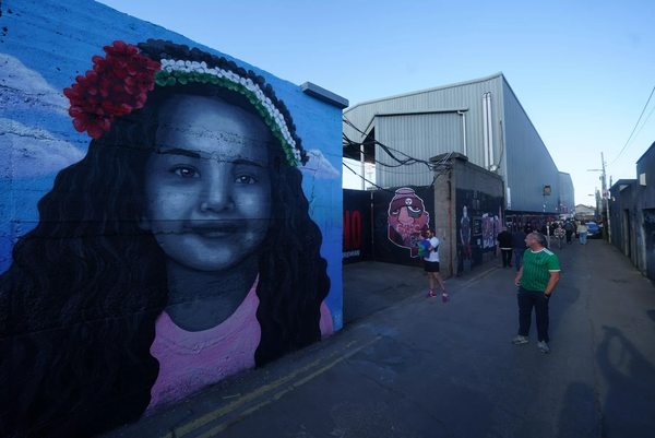 Bức tranh tường tại Dublin khắc họa hình ảnh Hind Rajab rạng rỡ trong tông màu đen trắng, chiếc áo hồng và vòng hoa đội đầu mang màu sắc của lá cờ Palestine.