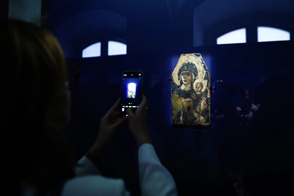 Một du khách đang chiêm ngưỡng tác phẩm "Virgin and Child," có niên đại từ thế kỷ thứ 6, của Bảo tàng Khanenko ở Kyiv, được trưng bày tại bảo tàng Louvre ở Paris.