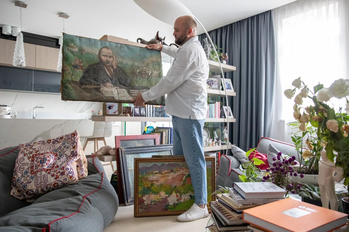 Nhà sử học người Ukraine Leonid Marushchak đã cứu được khoảng 2 triệu hiện vật từ các khu vực tiền tuyến, đôi khi là dưới những cuộc giao tranh ác liệt. Ở đây, ông đang cầm một bức tranh của nhà thơ người Ukraine, Taras Shevchenko.