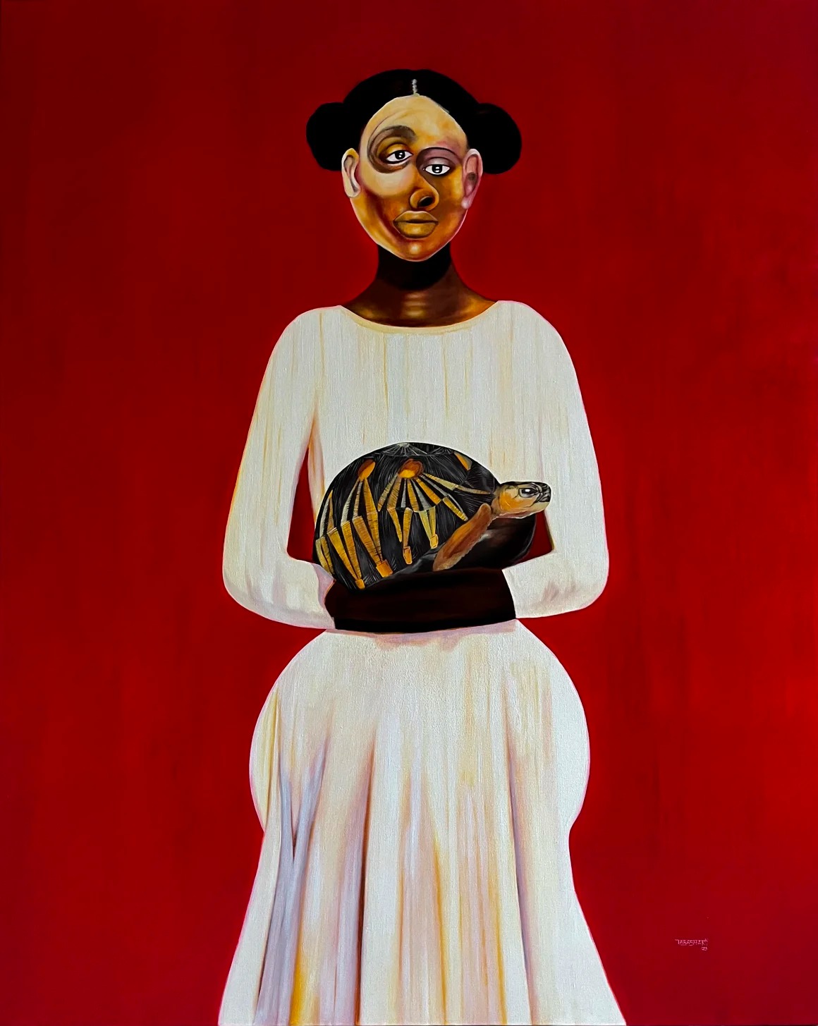 Trong số những tác phẩm được chọn, có bức “La Reine” (Nữ hoàng), khai thác nhiều tầng lớp của nữ tính và vai trò người phụ nữ. Một tác phẩm khác là “Astrochelys Radiata” – bức tranh về loài rùa sao quý hiếm tại Madagascar, gửi gắm thông điệp xúc động về bảo vệ sinh vật hoang dã. Cô còn gửi bức “Auto-portrait” (Chân dung tự họa) thể hiện hành trình tìm kiếm bản thể, cùng bức “Archive III” – lời nhắc nhớ về lịch sử đàn áp phụ nữ và quyết tâm không để thế hệ tương lai lặp lại.