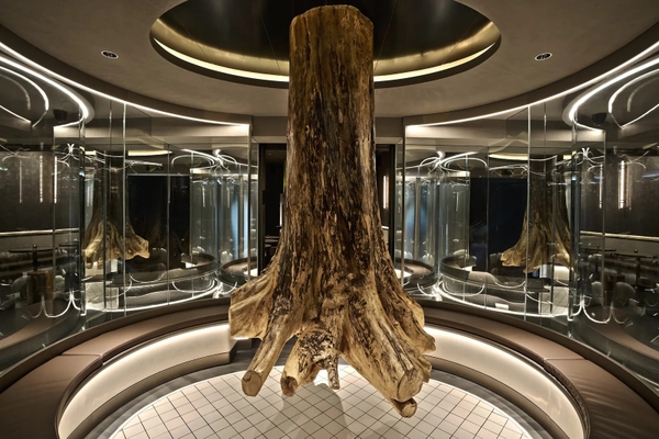 Penicillin không chỉ gây ấn tượng bằng công thức pha chế. Chính thiết kế nội thất quán bar cũng kể một câu chuyện về triết lý sống xanh, tối giản và không lãng phí. Ngay từ lối vào, một thân cây hackberry cổ thụ – được giải cứu từ vùng quê Thượng Hải – được treo lơ lửng giữa khung tròn gương phản chiếu. Bộ rễ khô sạm cách mặt đất vài phân như một biểu tượng sống động của sự tái sinh và kết nối tự nhiên – một chi tiết nghệ thuật trang trí vừa bất ngờ, vừa giàu chất thơ.