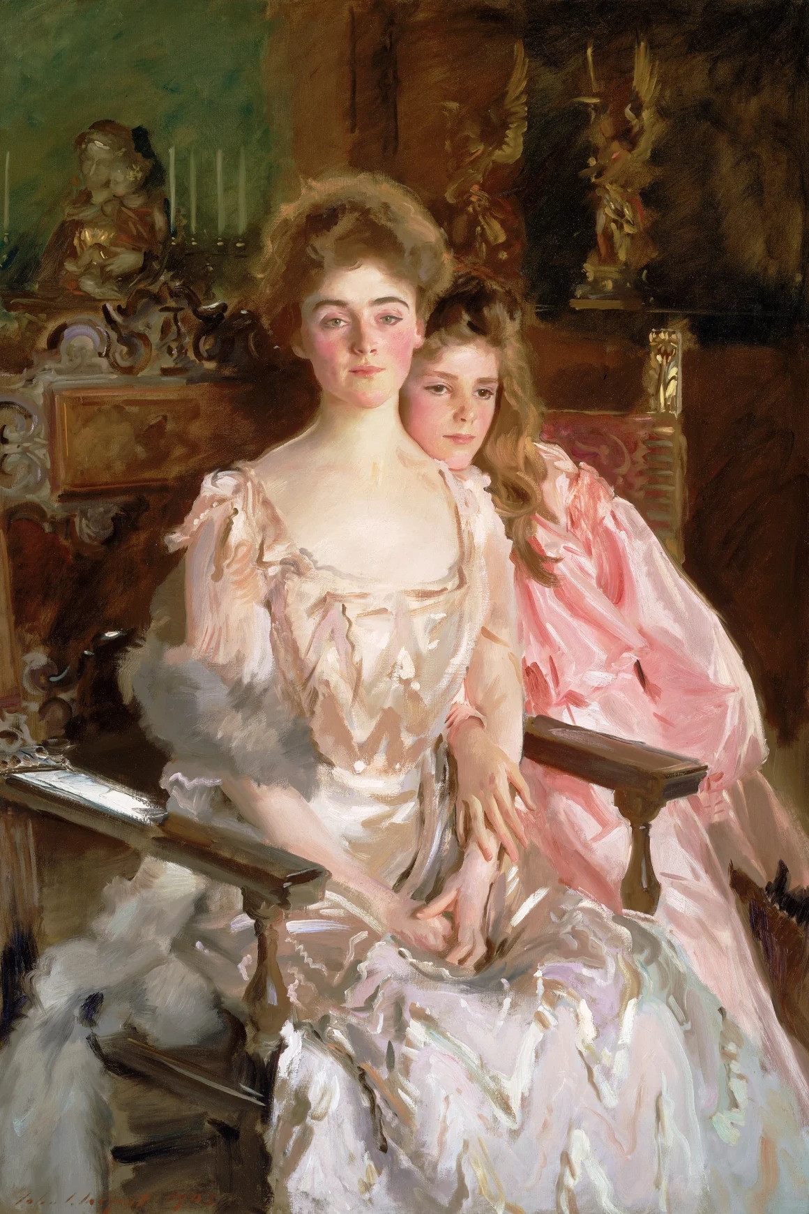 Từ trái sang phải, Gretchen và con gái Rachel Warren tạo dáng cho Sargent năm 1903. Rachel được tạo dáng trong một mảnh vải màu hồng mà Sargent chế tác trên vải để trở thành một chiếc váy.