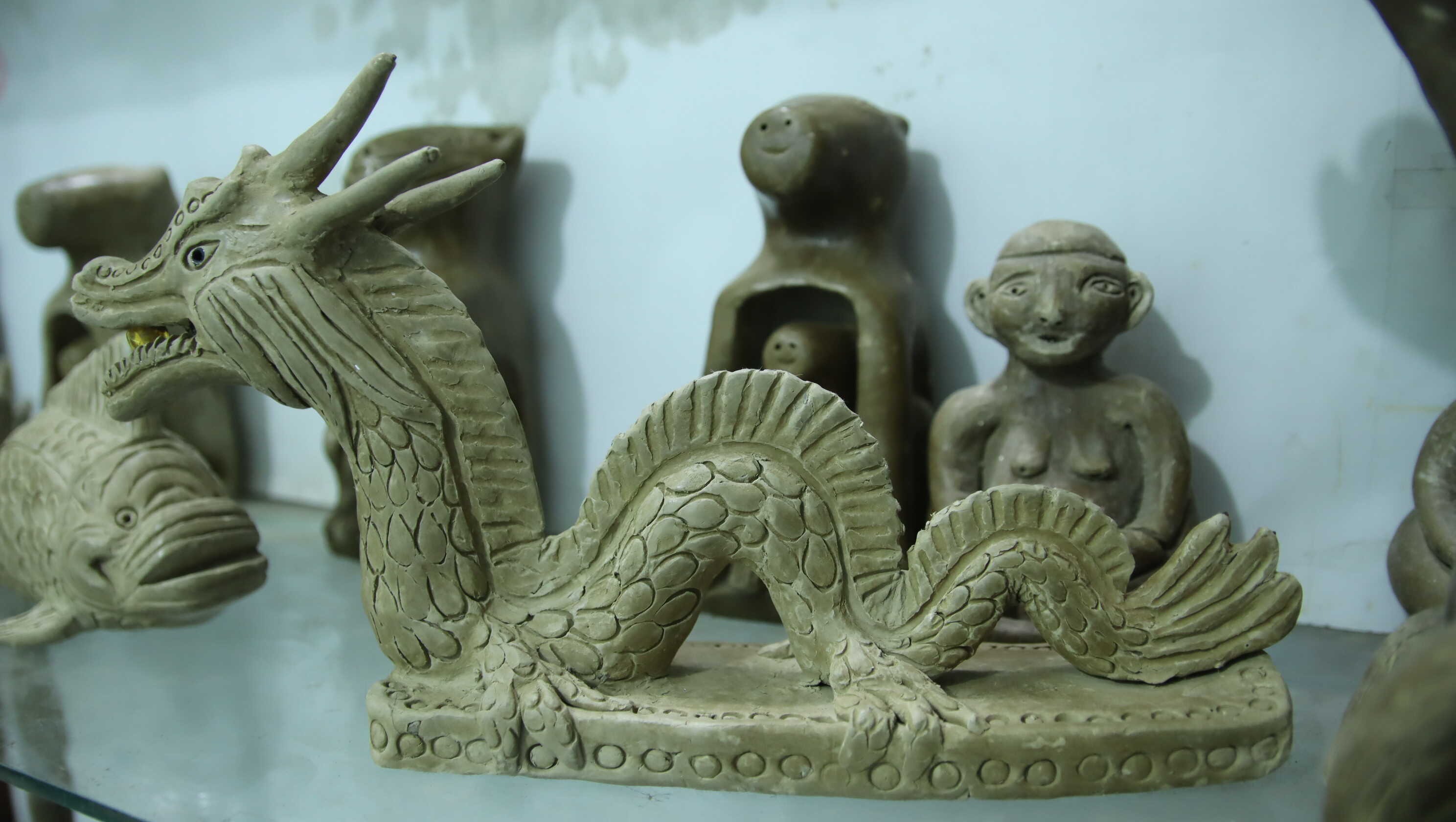 Vừa châm chiếc điếu bát cổ, ông vừa kể lại chuyện nghề cho chúng tôi nghe. Cách ông nâng niu từng pho tượng nhỏ, từng nét đất gốm như thể ôm trọn cả một đời ký ức và tình yêu nghề.