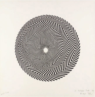 Nghệ sĩ người Anh Bridget Riley là một trong những người thực hành Op Art nổi bật nhất. Tác phẩm nghệ thuật năm 1964 của cô Blaze có các đường thẳng ngoằn ngoèo màu đen và trắng tạo ra ảo giác về một ngôi nhà tròn.