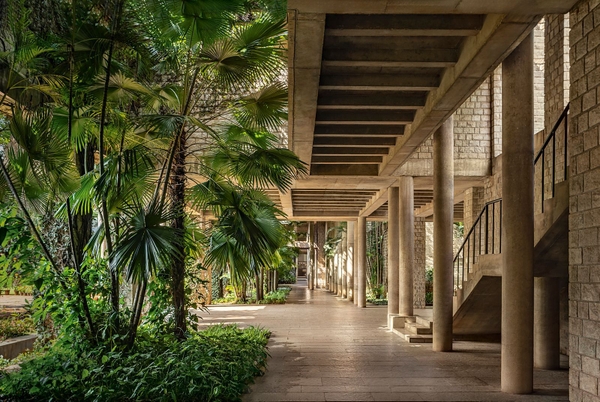 Tuy nhiên, ở Doshi, kiến trúc không dừng lại ở lý tính. Ông mang vào đó nét sống động, mềm mại đặc trưng của miền nhiệt đới: cây cối đan xen trong các khoảng thông tầng, sân trong trở thành không gian sinh hoạt chứ không chỉ là yếu tố kỹ thuật. Công trình vì thế không chỉ là nơi ở hay làm việc, mà là một phần trong đời sống – thở cùng khí hậu, chan hòa ánh sáng và bóng râm.
