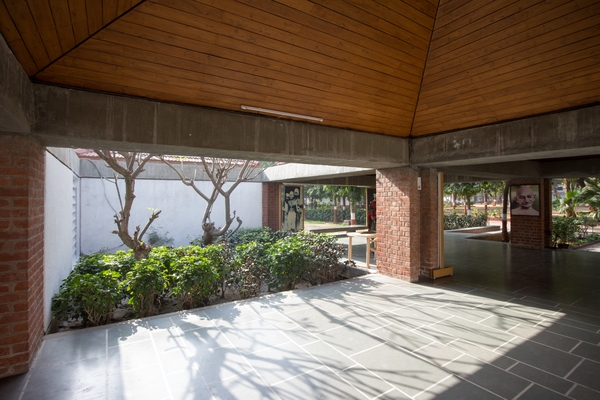 Ngược lại, Louis Kahn chọn tiếp cận gạch như một cấu kiện chịu lực thực thụ. Với ông, mỗi bề mặt đều phản ánh trạng thái làm việc của cấu trúc. Những vòm gạch được chống đỡ bằng lanh tô bê tông, những ô cửa với cách đặt gạch thay đổi phương vị – tất cả đều được tính toán cẩn trọng theo nguyên tắc kết cấu. Đây là sự tiếp nối tinh thần từ những công trình ông từng thiết kế ở Hoa Kỳ như Thư viện Exeter hay Phòng thí nghiệm Richards – những biểu tượng của thế kỷ XX về sự phối hợp nhịp nhàng giữa gạch và bê tông. Và trong ngôn ngữ kiến trúc của Kahn, người ta còn nhận ra một điều gần gũi với tín ngưỡng dân gian Ấn Độ: cảm giác thiêng liêng, huyền ảo, dường như luôn hiện diện trong những khoảng tối – sáng đầy kịch tính của công trình.